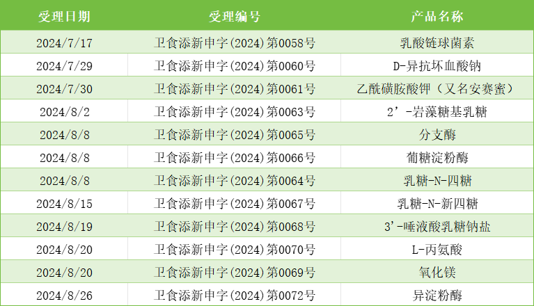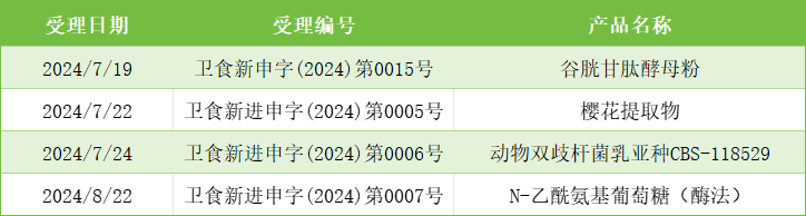 从受理统计中可见,2022年有企业提报樱花提取物为新食品原料,2024年7月2日收到不予行政许可的通知,7月22日再次受理,可能是同一家企业进行资料的修订后的再次提报,具体不得而知。