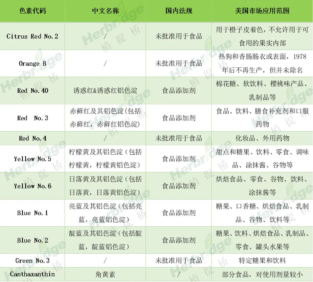 沃尔玛美国将从其自有食品品牌中去除以下11种合成色素,包括橙红2号(Citrus Red No. 2)、诱惑红(Red No. 40)、柠檬黄(Yellow No. 5)、日落黄(Yellow No. 6)、亮蓝(Blue No. 1)、靓蓝(Blue No. 2)、固绿(Green No. 3)、角黄素等。
